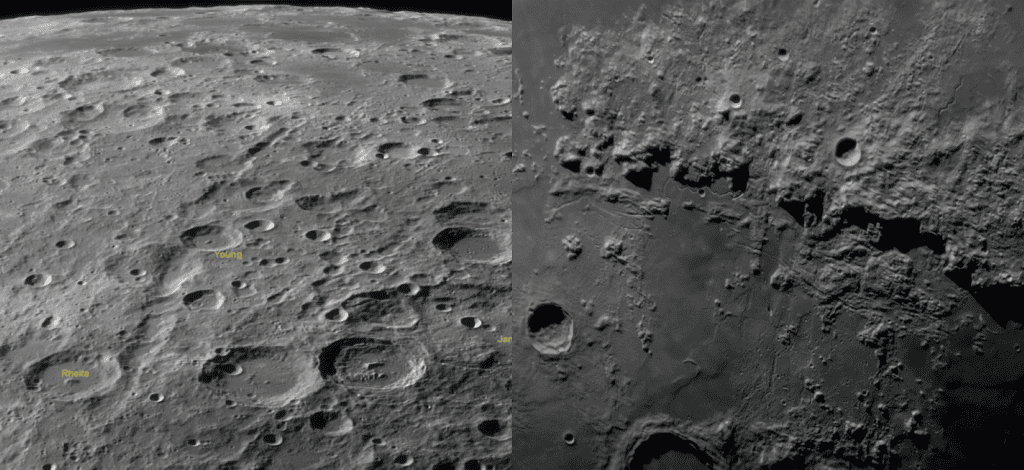 A primeira imagem mostra a região de Valis Rheita próxima à borda sudeste da Lua. O vale, que pode ser visto cortando a metade esquerda da imagem, tem cerca de 30 km de largura, 445km de extensão, e está orientado radialmente ao Mare Nectaris, uma imensa bacia formada há 3,9 bilhões de anos pelo impacto de um grande asteroide. O impacto cavou um buraco profundo e lançou imensos pedregulhos de até 2 quilômetros, e que se chocaram de volta com superfície lunar, salpicando de crateras secundárias a região registrada nesta foto.