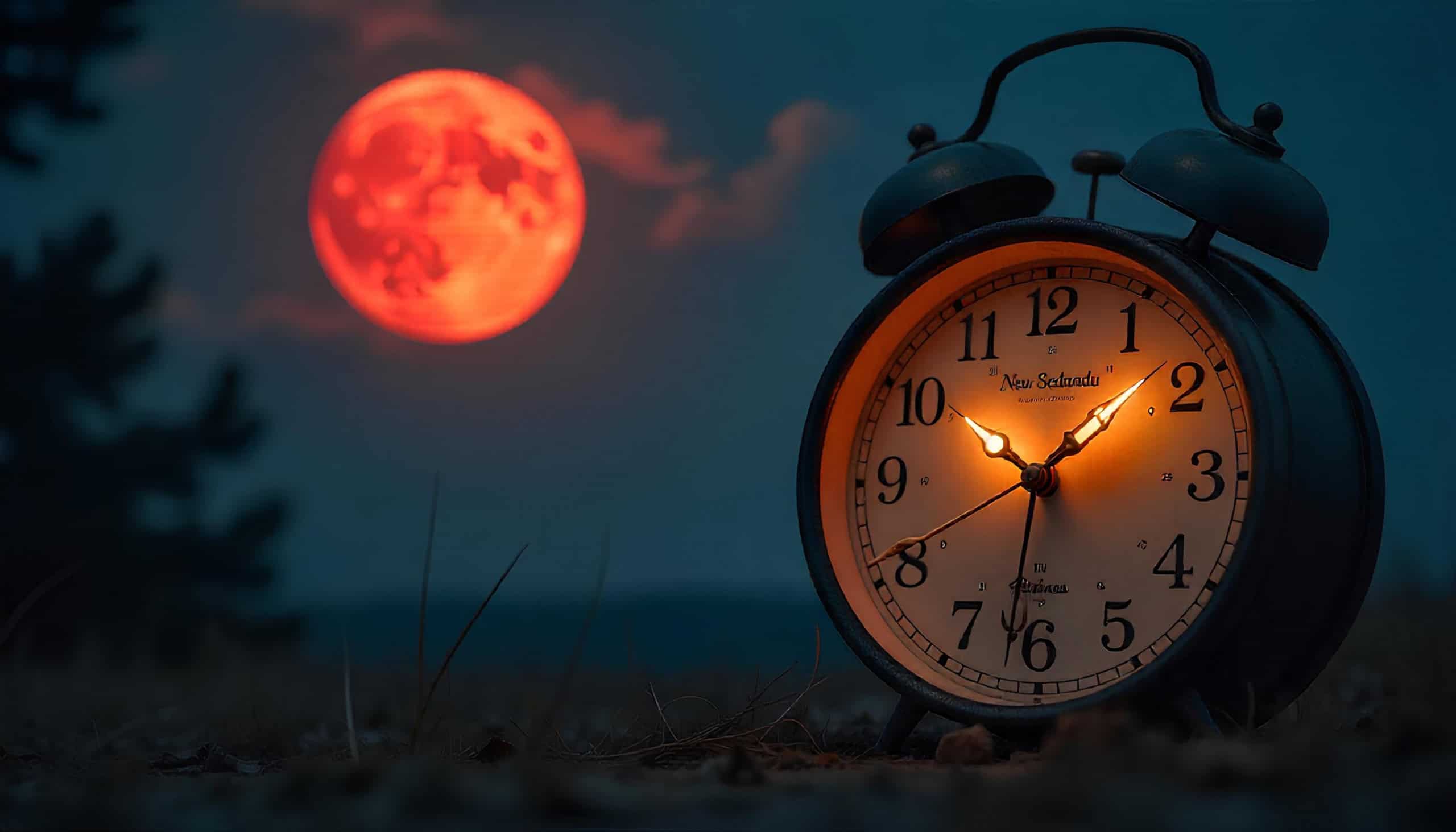Imagem-conceito do horário que ocorre um eclipse lunar total com um relógio em primeiro plano e uma lua de sangue em segundo plano
