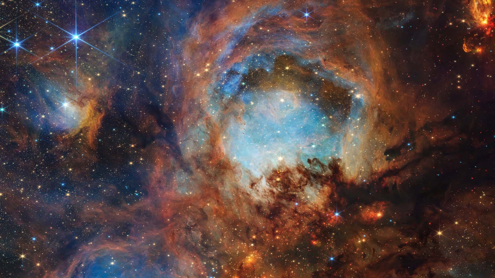 O registro mostra a Nebulosa Pata de Gato (NGC 6334), uma região com formação estelar intensa localizada a mais de 4 mil anos-luz da Terra, na constelação de Escorpião. Graças à capacidade do James Webb de observar em luz infravermelha, é possível enxergar as nuvens densas desse ambiente caótico e obscuro como nunca antes.